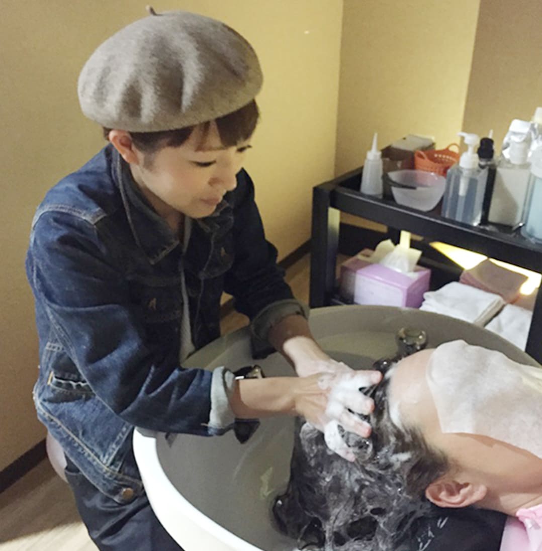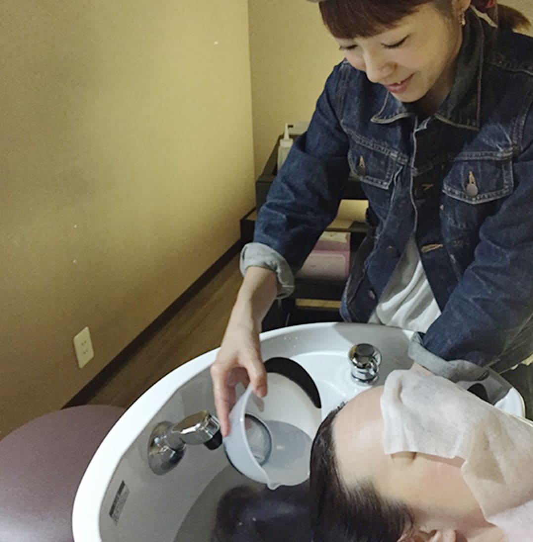 通常のシャンプーでは落としきれない毛穴に詰まった脂質や、クレンジングシャンプー髪に残っている不純物をしっかりと除去します。髪に優しい薬剤を使用いたしますので、薬剤が髪にしっかり浸透するように素髪の状態にもどします。24時間シャンプーできないので、丁寧に念入りに・・・。(トリートメントエステの場合ははじめにマッサージシャンプーします。)